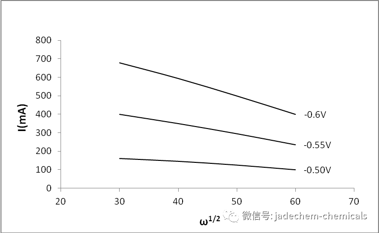 而加入了整平劑后(圖2),隨著圓盤電極轉速的增加,陰極極化曲線也隨之變化:在同一電勢下,電流下降了不少。根據這一趨勢,經過數學處理、作圖(圖3):